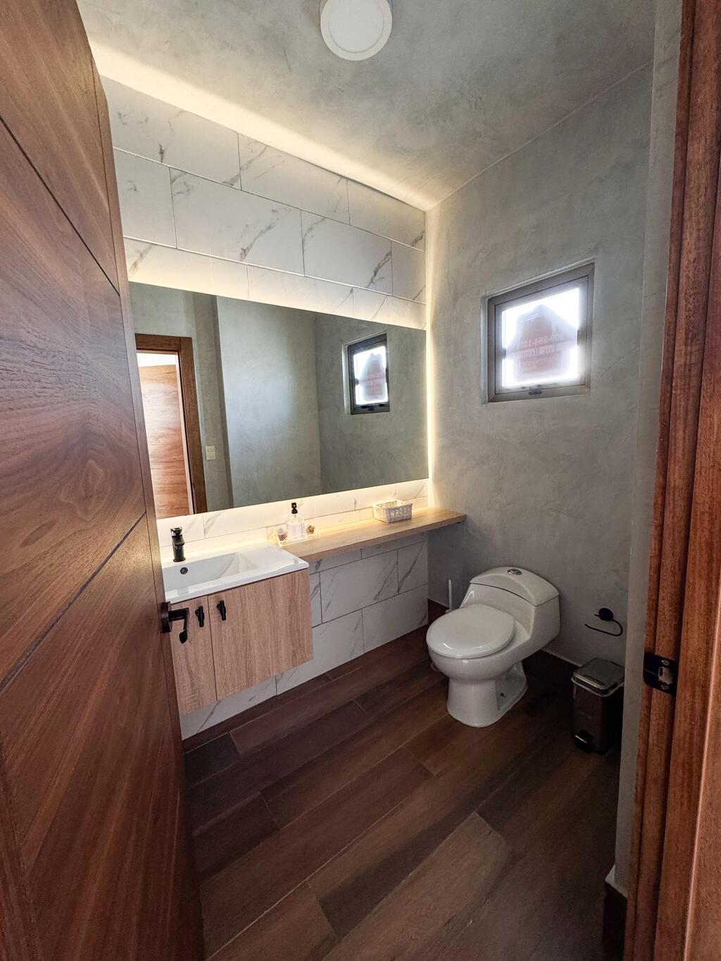 3.5 baños, destacando un baño completo para las habitaciones secundarias y un medio baño de cortesía para visitas.